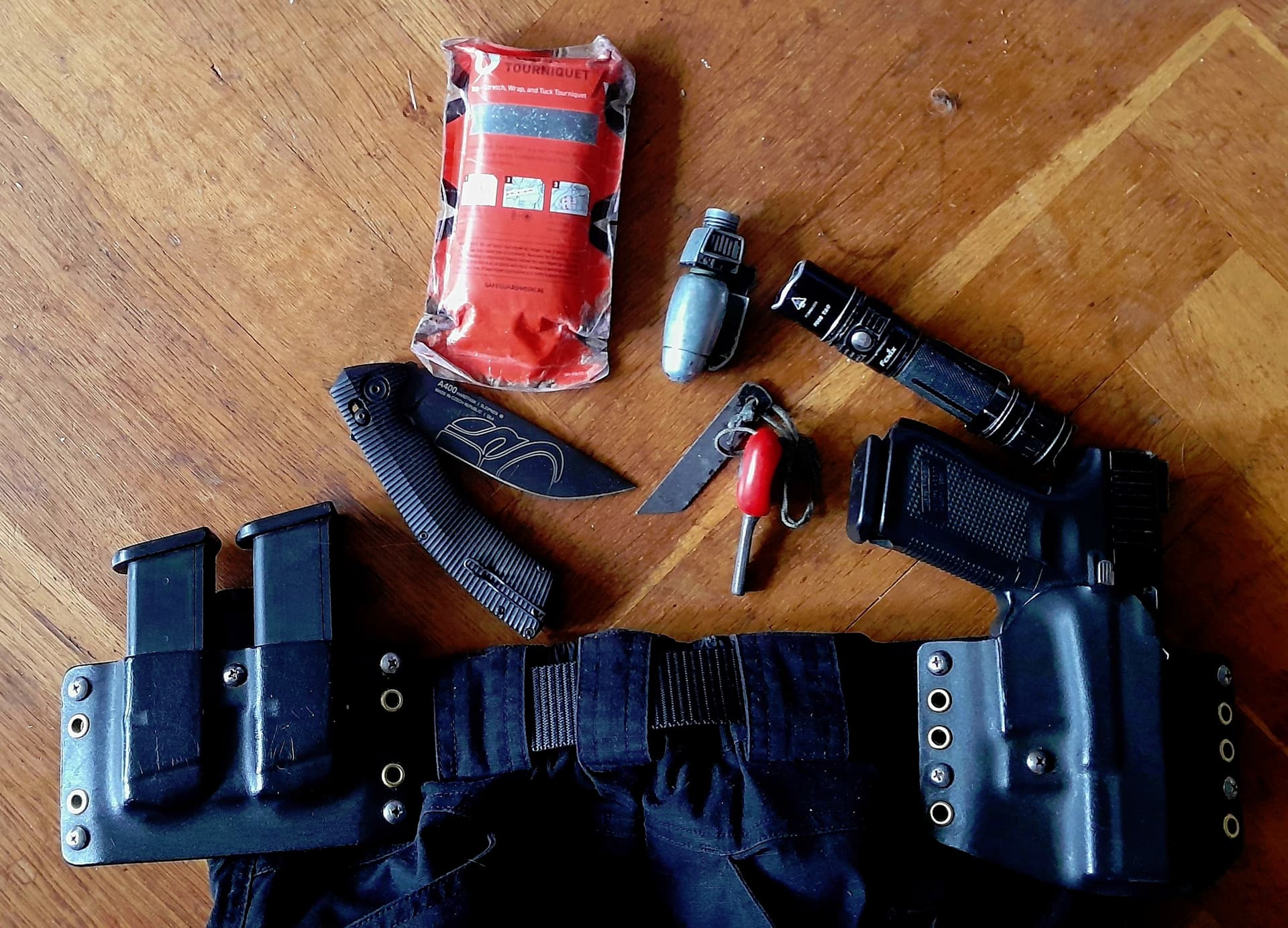 Nekolik krabicek naboju mam ve strelckym batohu a ten je v aute neustale, takze s pripadnymi “necekanymi treninky” neni zadny problem. Skrtidlo proto, ze v nekterych pripadech pomoci bliznimu je skrtidlo uzitecnejsi nez zbran. Baterka je nejcasteji pouzivany kus vybaveni a krome sviceni se hodi i na sebeobranu. Zapalovac kvuli ohni, to da rozum. A proc k nemu kresadlo ? Pred cca 10 lety jsou ho jednou v kapse nemel a stalo me to 1000 kliku. Po ctyrech mesicich pekelnyho treninku jsme je dal za hodinu. Od te doby je v kapse neustale, protoze tohle uz opakovat nechci.