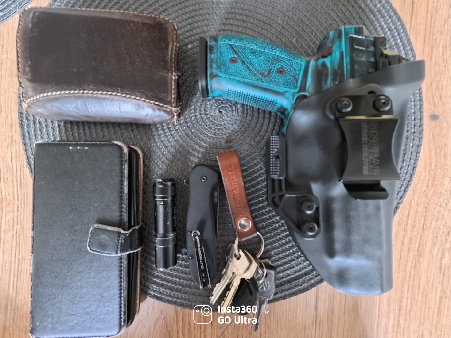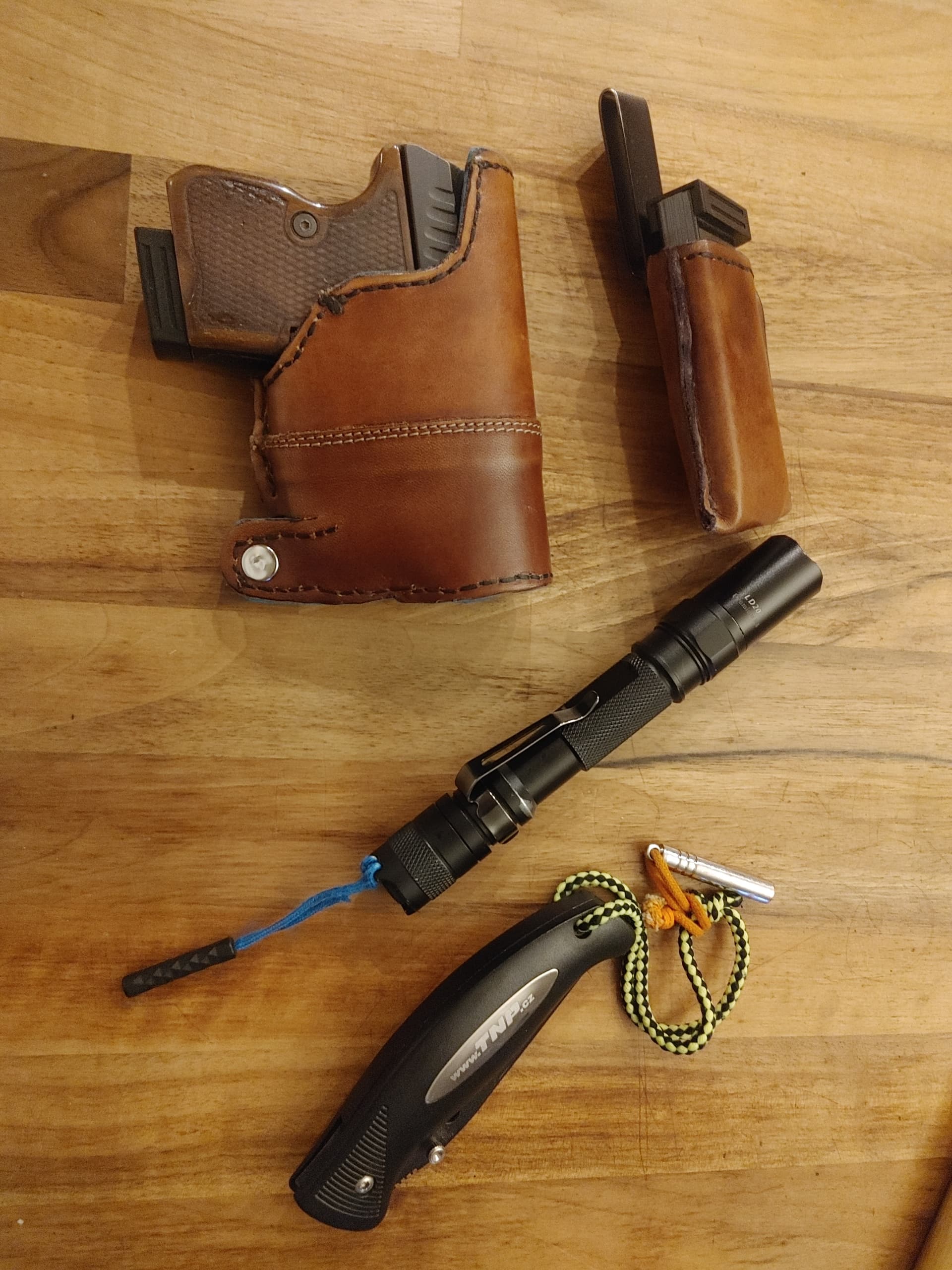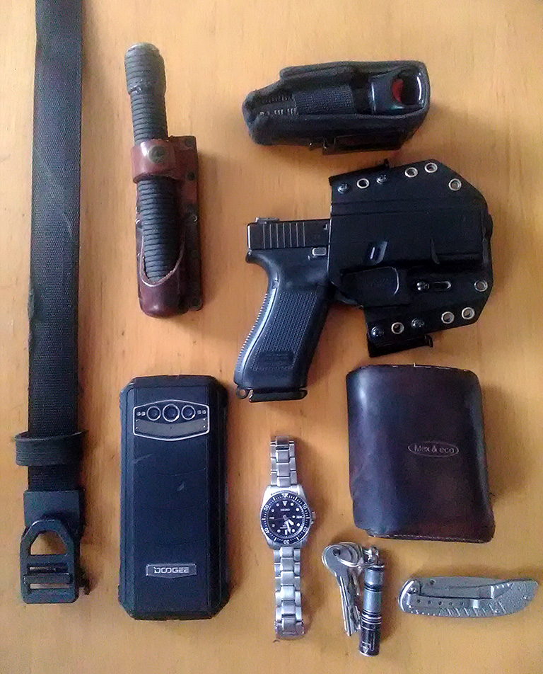 Ten obušek nosím jen občas, zbytek je moje 100% EDC - občas vyměním G45 za G26, když nechci moc printovat. A samozřejmě +klíče od auta, když jedu autem (ale nenosím je furt) a podobné serepetičky.