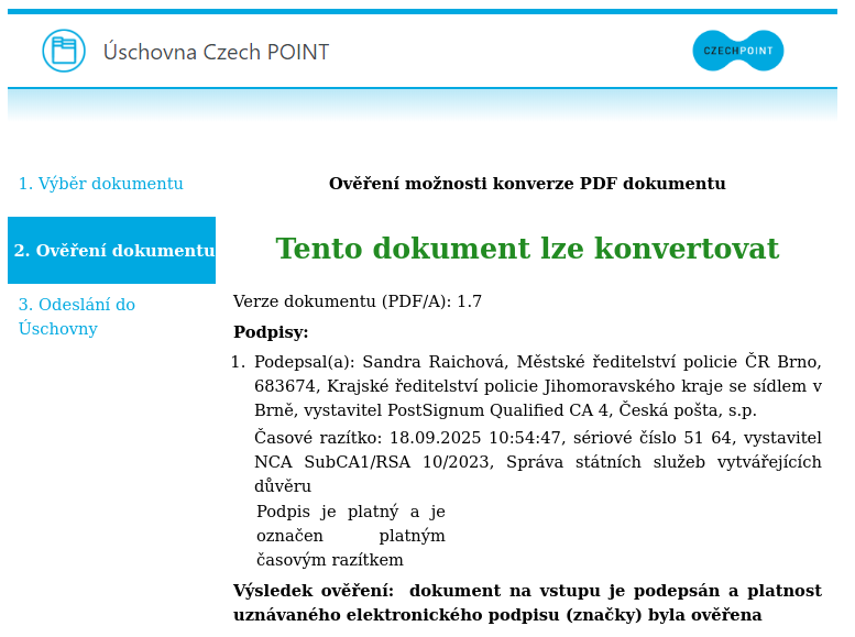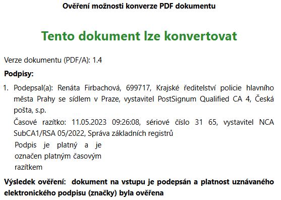 V našem případě podpis vydala pověřená osoba (referentka KŘP Jihomoravského kraje) a podpis je platný a byl vystaven správnou certifikační autoritou (zde vidíme, že to je PostSignum Qualified CA). Navíc je označen časovým razítkem, které potvrzuje čas vzniku dokumentu.