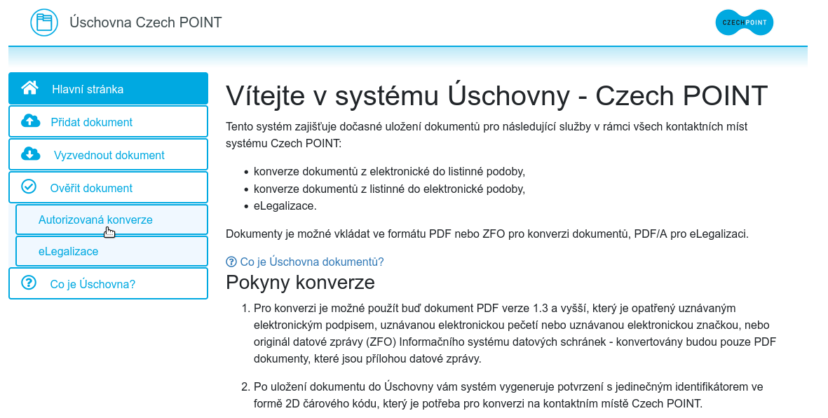 Z menu webové stránky klikneme na položku Ověřit dokument a přejdeme na odkaz Autorizovaná konverze: