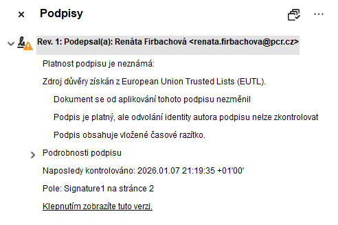 Pokud máte na svém zařízení nainstalován program Adobe Acrobat Reader, jednoduše otevřete daný soubor, klikněte v nástrojové liště na symbol podpisu a otevřete detail elektronického podpisu pro získání podrobných informací:
