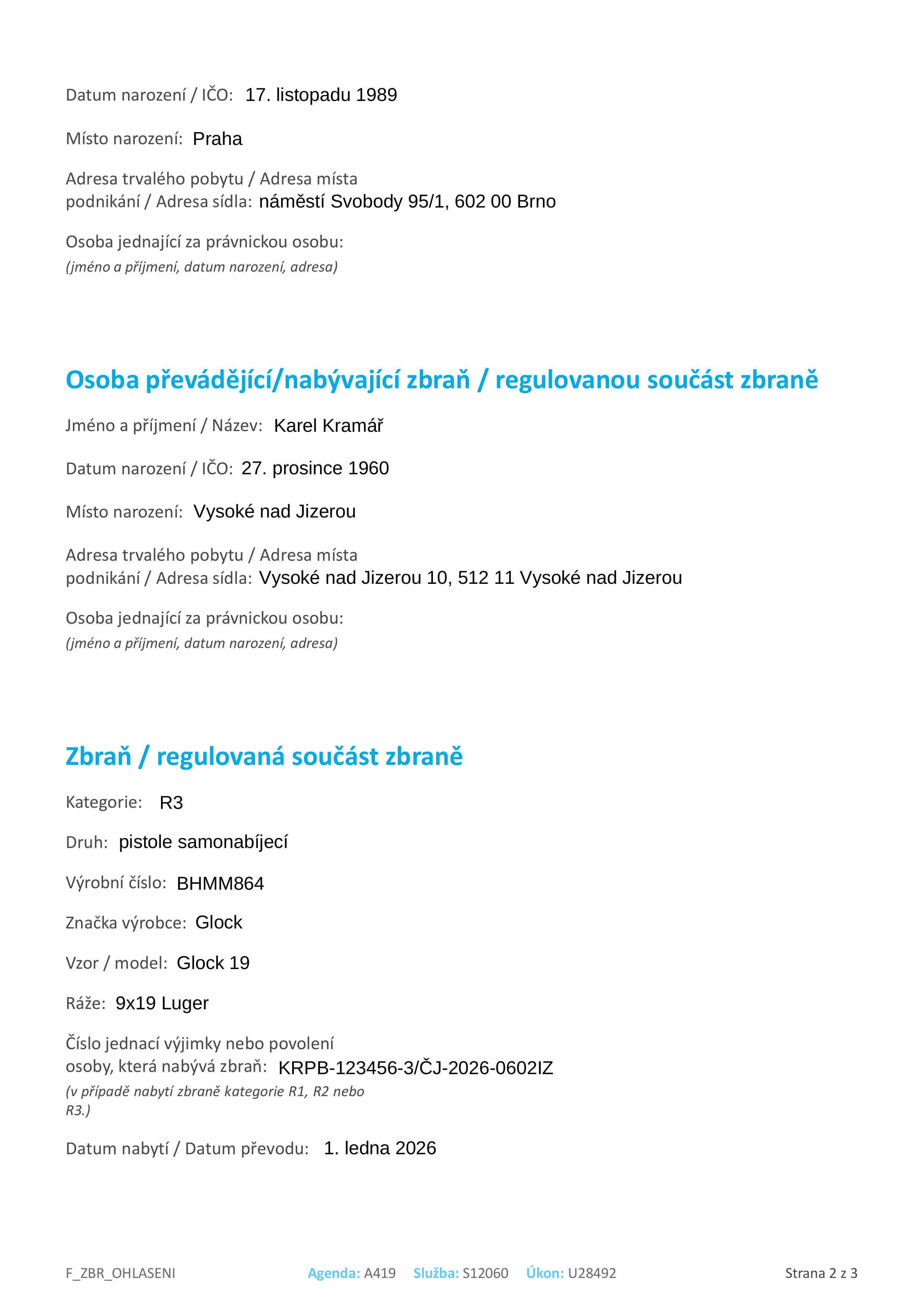 Prodejce má povinnost obdobně vyplnit stejný formulář (typ ohlašovatele bude „převádějící zbraň“) a nahlásit tak převod zbraně. K tomu bude muset znát vaše osobní údaje.