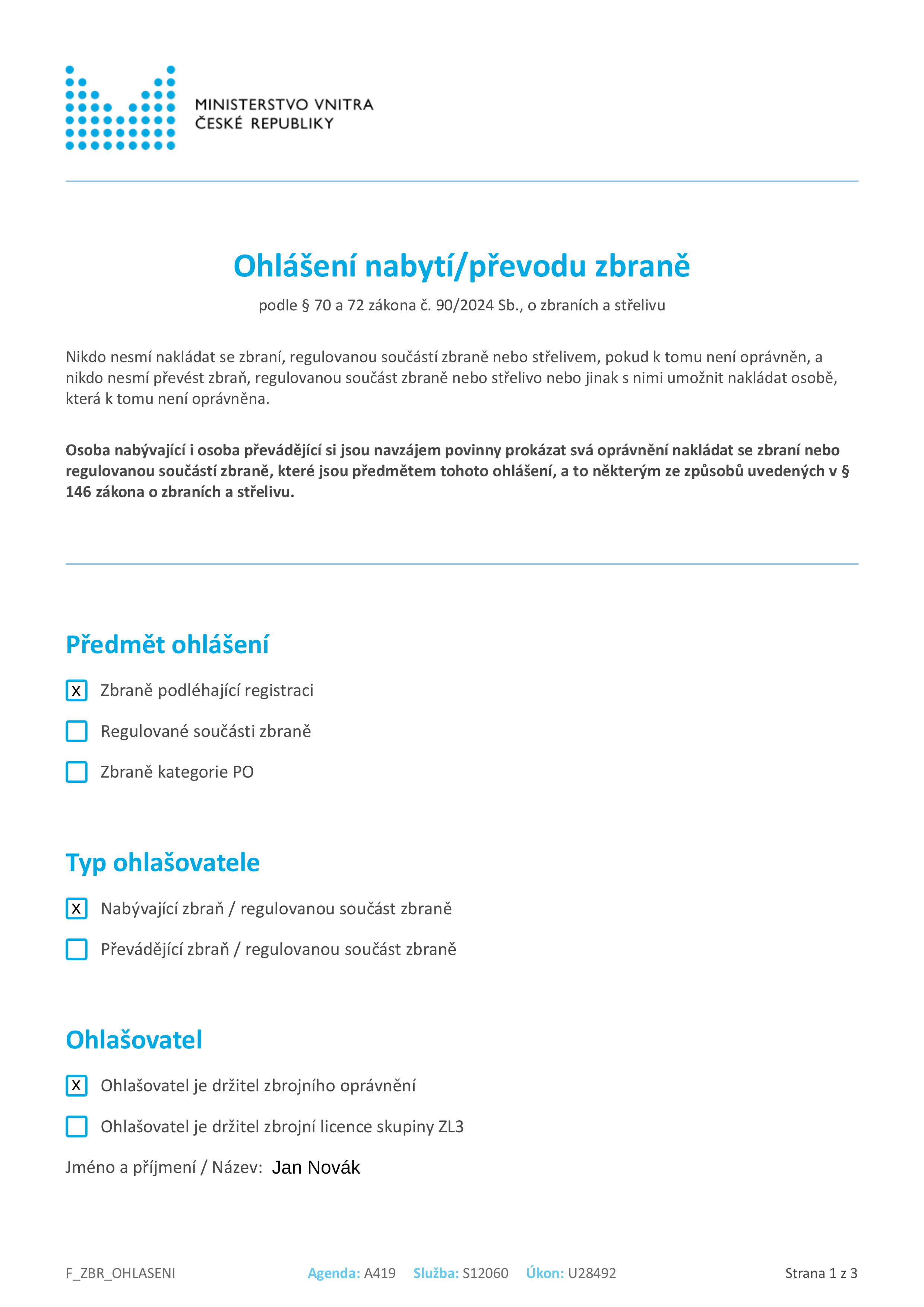 Jakmile nabudete zbraň, začíná vám běžet zákonná povinnost zbraň do deseti pracovních dní registrovat a předložit zbraň k prohlídce jejího označení a technického stavu. Registrace se dělá pomocí formuláře pro ohlášení nabytí zbraně (již zmíněného „šediváku“), který naleznete na Podacím portálu Ministerstva vnitra a takto ho vyplníte: