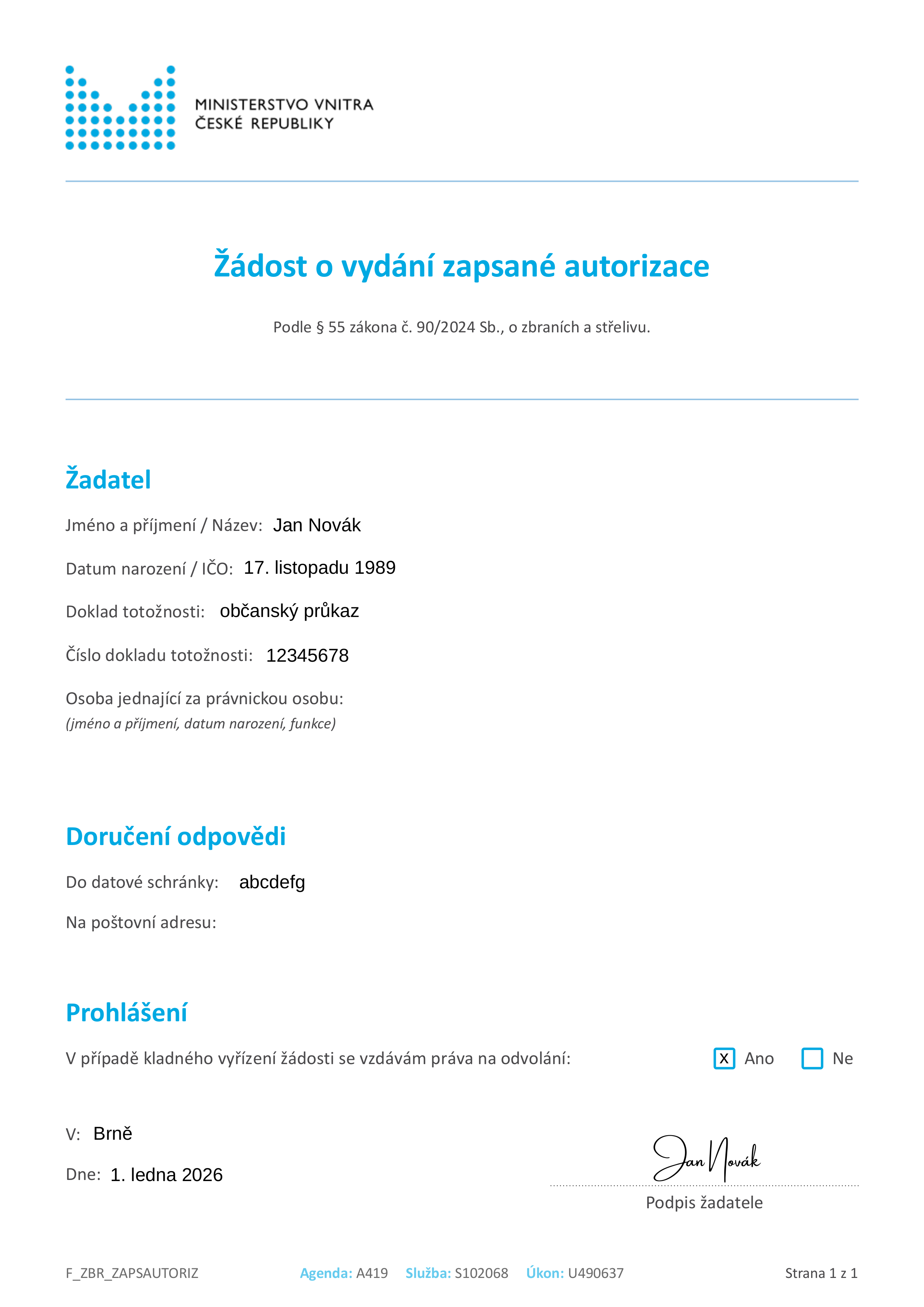 O zapsanou autorizaci lze požádat prostřednictvím formuláře Žádost o vydání zapsané autorizace z Podacího portálu Ministerstva vnitra osobně u libovolné pobočky OSZBM (vizte naši mapu OSZBM), a to buď osobně, nebo zasláním vyplněného elektronického formuláře prostřednictvím podacího portálu, datové schránky nebo e-mailem se zaručeným elektronickým podpisem.