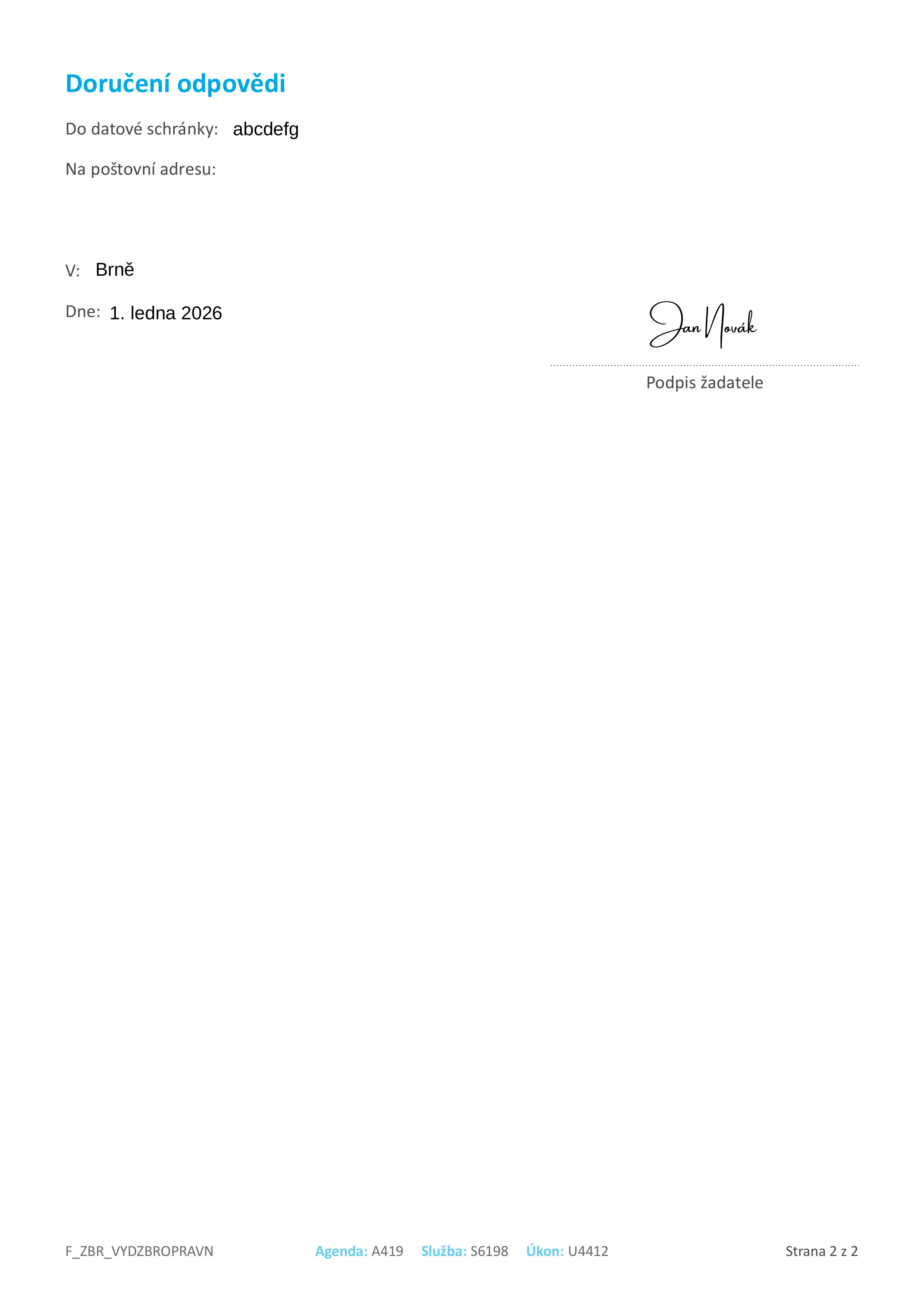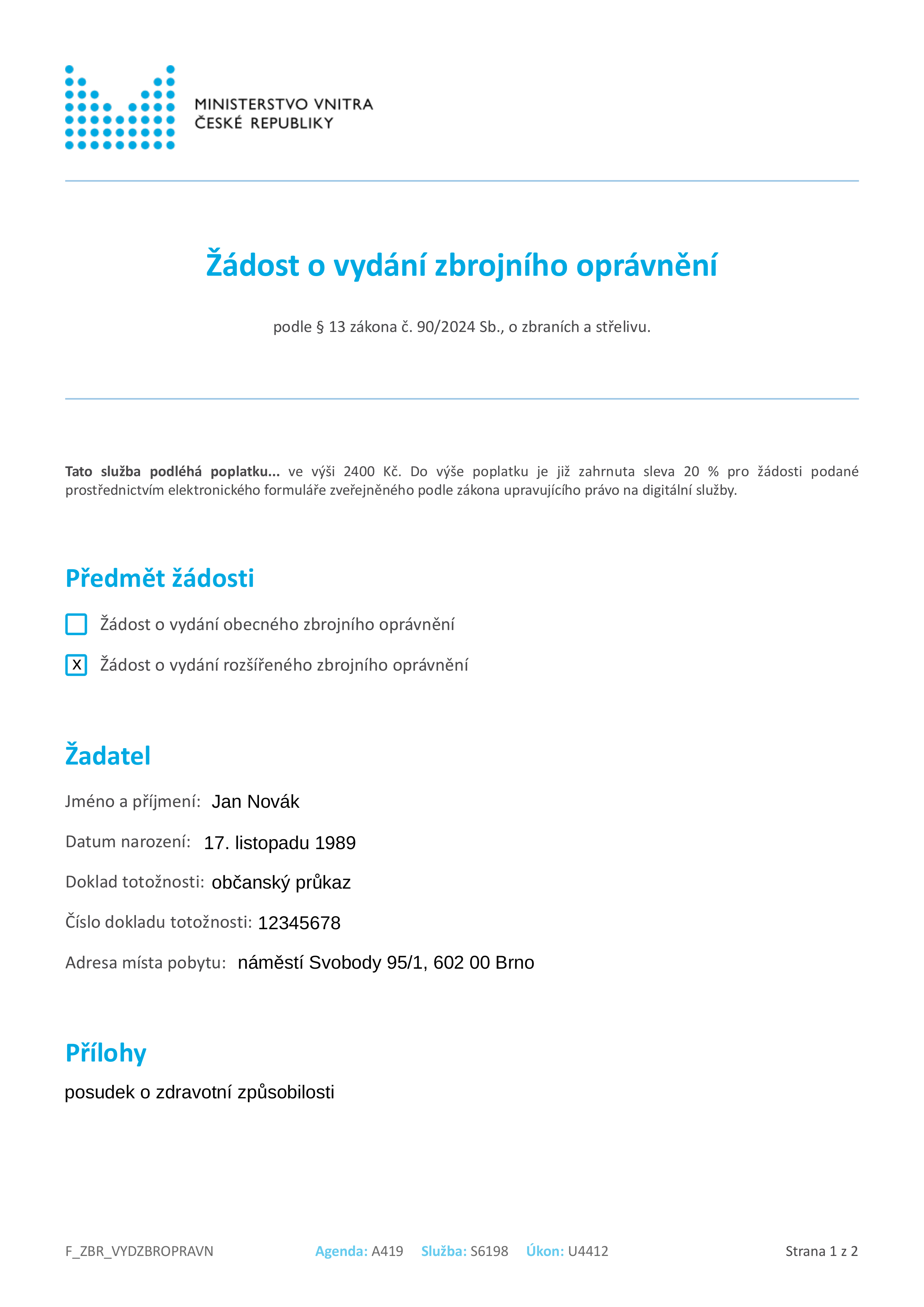 Alternativně lze formulář stáhnout a vyplnit v PDF formátu, zaslat ho datovou schránkou nebo e-mailem doplněným uznávaným elektronickým podpisem na podatelnu libovolného krajského ředitelství policie, případně si tento formulář můžete vytisknout, vyplnit ručně a zanést na nejbližší pobočku OSZBM. V takovém případě však budete platit plný správní poplatek ve výši 3 000 Kč namísto sníženého 2 400 Kč.