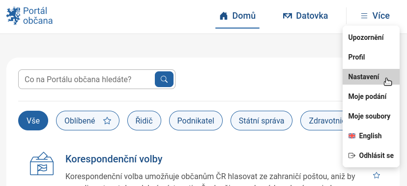 Po přihlášení (prostřednictvím datové schránky nebo identity občana) do Portálu občana vyberte v menu položku Nastavení: