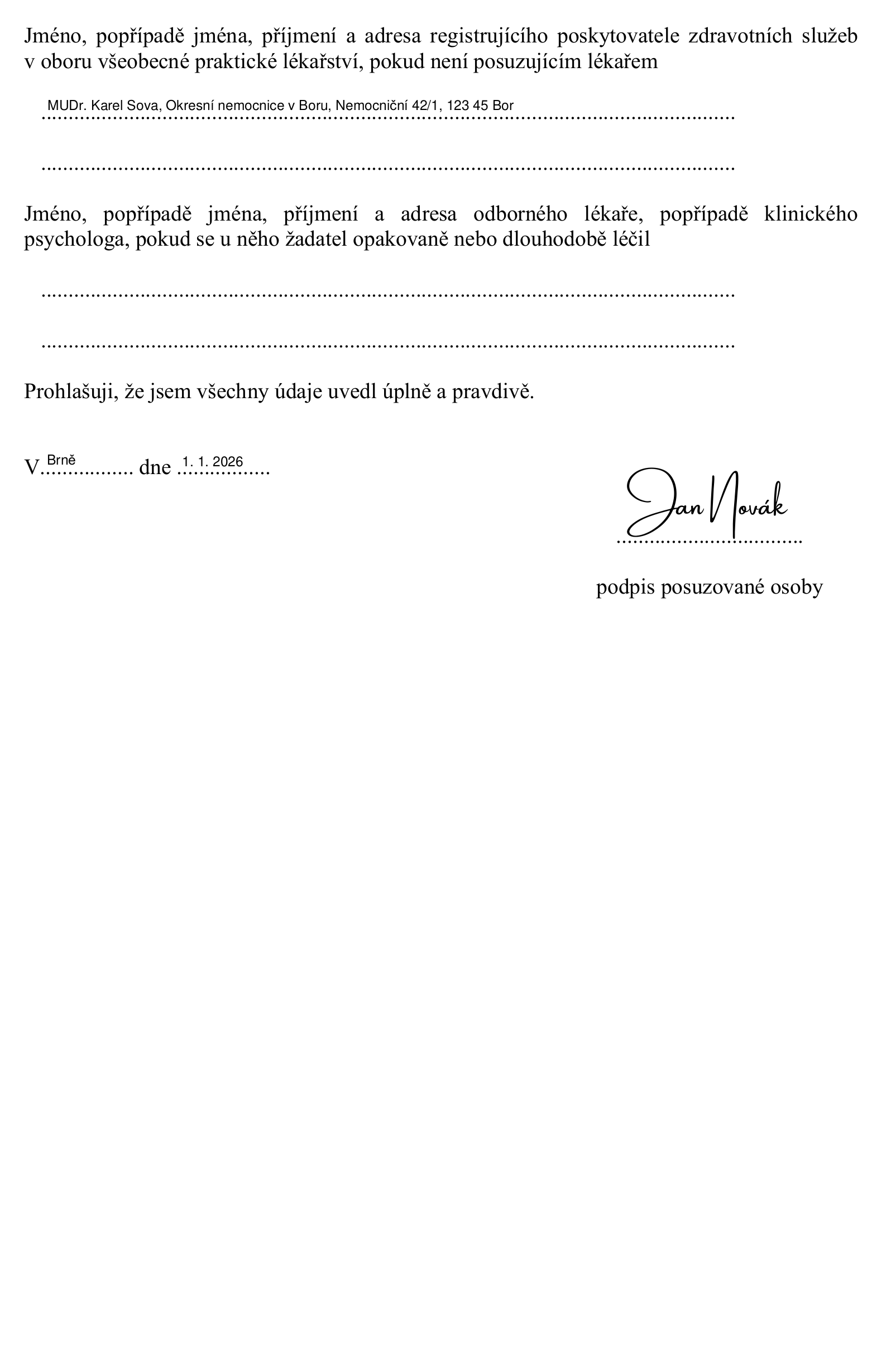 Nejprve ale musíte vyplnit a lékaři odevzdat prohlášení posuzované osoby, což je dokument, na základě kterého vám lékař může vydat posudek o zdravotní způsobilosti. Takto vypadá jeho typické vyplnění: