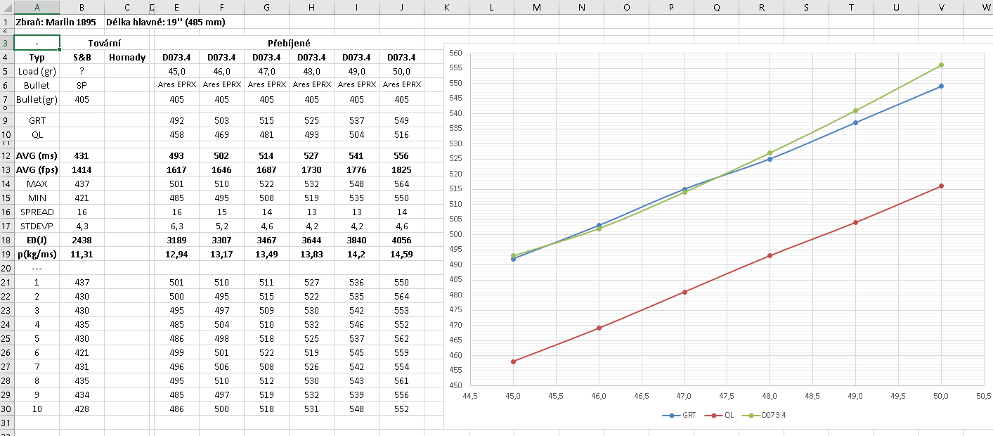 Vyrobil jsem tedy několik sad nábojů s navážkou od 45 do 50 grs prachu, vzal pod křídlo hradla, pušku a vyrazil na střelnici. Po několika hodinách, příjemně strávených v oblacích kouře a plamene a s modrým ramenem jsem měl k dispozici tyto výsledky (v grafu jsou zaneseny i výsledky simulací GTR a QL – je vidět, že GRT mělo velmi blízko k reálným datům):