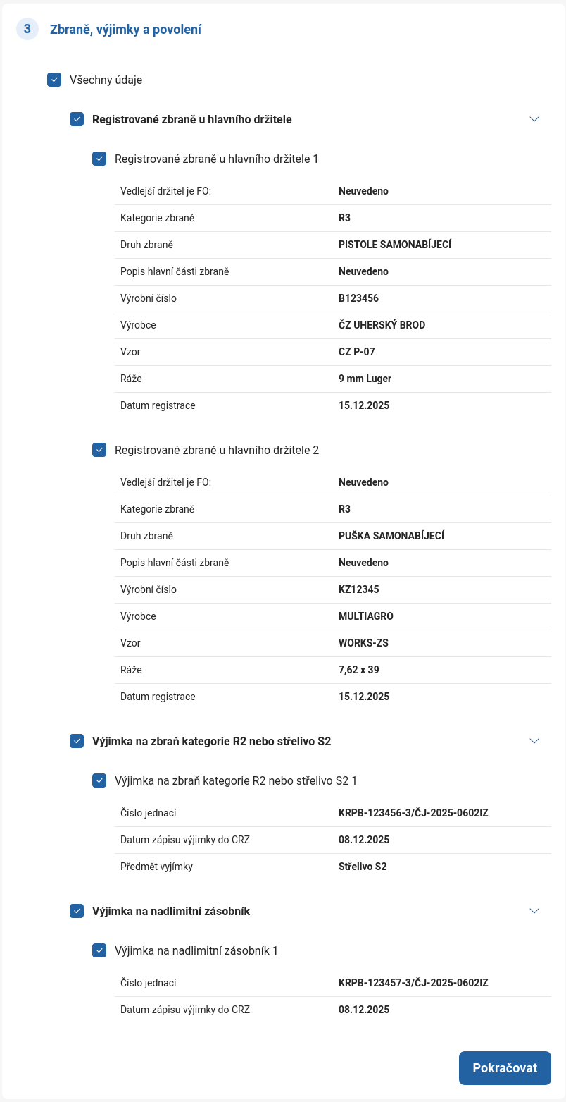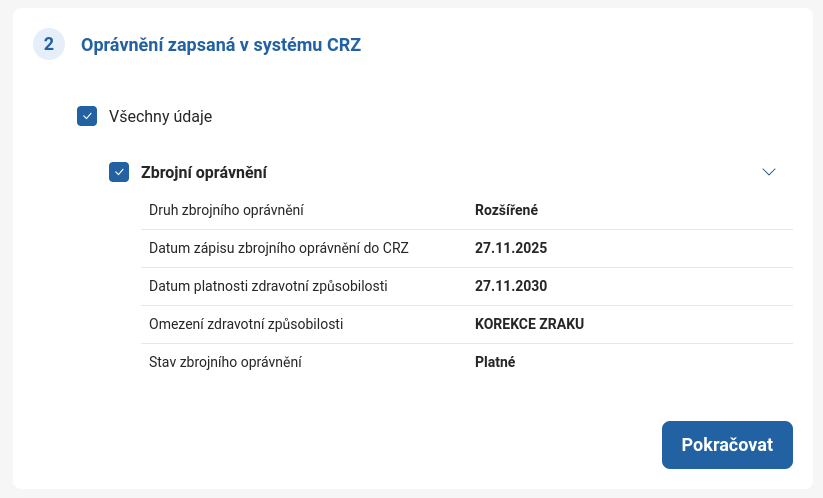 Následně vyberte oprávnění (jako je zbrojní oprávnění, zbrojní licence, evropský zbrojní pas, muniční oprávnění, aprobace nebo zapsaná autorizace), která chcete vypsat, a potvrďte výběr tlačítkem Pokračovat: