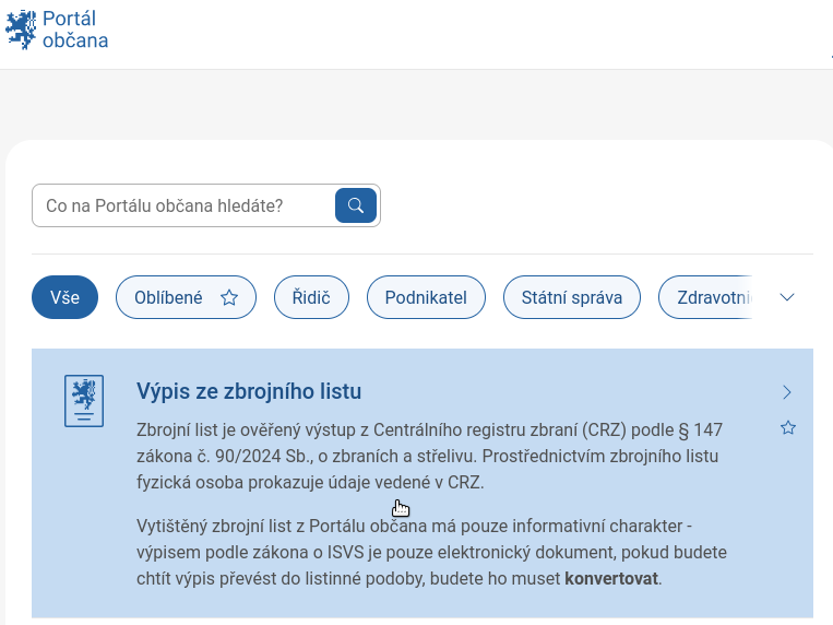 Portál občana poskytuje elektronickou podobu zbrojního listu.